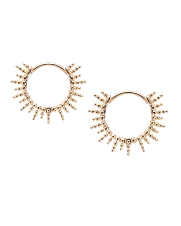 Un moderno accesorio que sirve para complementar cualquier ocasión especial. Del aro salen unos pinchos compuestos por bolas esféricas que parecen imitar los rayos de un sol. Unos pendientes favorecedores y cómodos ideales para llevar 24 horas al día.